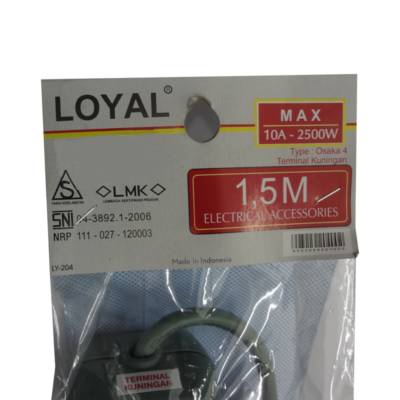 Loyal Osaka LY-204 Stop Kontak 4 Lubang / Kabel 1,5M Adalah Stop Kontak Yang Dilengkapi Dengan saklar ON/OFF Dengan Lampu Indikator Dan Kabel Sepanjang 1,5M Sehingga Membuat Mudah Dipasang Dimana Saja, Dan Mudah Dibawa Kemana-mana. Stop Kontak Yang Telah Berstandard SNI Ini Menggunakan Terminal Dan Pin Berbahan Kuningan.